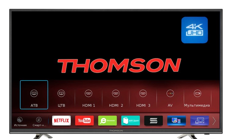 Телевизор Thomson модели T65USM5200 не включается, сам выключается, нет подсветки, нет изображения, перестал работать звук, сломался разъем, отсутствует сигнал, не видит подключаемые устройства, не переключает каналы, изображение двоится (троится, продублировано много раз), изображение только черно-белое, не перепрошивается, на экране появилась полоса.